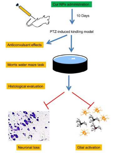 癫痫是一种慢性脑部疾病,以神经元过度放电导致反复、发作性和短暂性的中枢神经系统功能异常为特征。目前,苯巴比妥、奥卡西平等一线抗癫痫药物可以控制大部分患者的癫痫发作,但仍有部分患者疗效较差。研究表明Cur能够抑制NF-kB介导的转录、炎性细胞因子、iNOS和Cox-2的产生,从而产生其抗氧化和抗炎特性,改善癫痫症状,提示Cur在癫痫发生过程中的神经保护和神经调节作用。目前,尚无随机对照试验证实Cur-NPs对癫痫的治疗作用,但在戊四唑诱导的癫痫小鼠腹腔内注射Cur-NPs,可有效改善慢性癫痫小鼠的记忆障碍,降低激活的神经胶质细胞水平,产生抗惊厥作用(见图3)[4]。