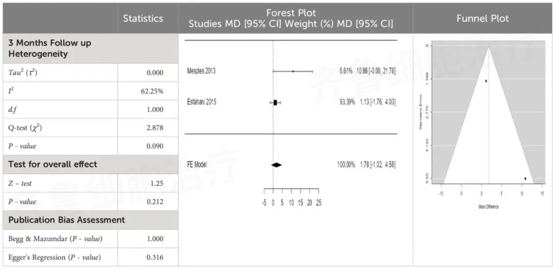 研究结果:与基线相比,MSC组在最后一次随访时的HbA1c显著降低(MD: 0.95,95% CI: 0.33至1.57,P-值:0.003< 0.05),患者的胰岛素需求显著较低(MD: 0.19,95% CI: 0.07至0.31,P-值:0.002< 0.05),与基线相比,MSC移植的FBG水平显著下降(MD: 1.78,95% CI: -1.02至4.58,P-值:0.212),MSC组的FPG水平显著较低(MD: -0.77,95% CI: -2.36至0.81,P-值:0.339 > 0.05),并且MSC组的空腹C肽水平略高(MD: -0.02,95% CI: -0.07至0.02,P-值:0.231 > 0.05)。