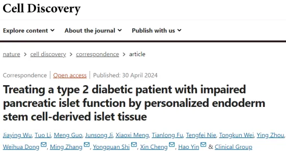 国际学术期刊《细胞发现》(Cell Discovery)在线发表了题为“Treating a type 2 diabetic patient with impaired pancreatic islet function by personalized endoderm stem cell-derived islet tissue”的研究成果。“国内干细胞治愈严重2型糖尿病患者,并停用胰岛素33个月”这是我国干细胞与再生医学领域的重大突破,是国际上首次利用干细胞技术成功再生人类胰岛组织,也为我们揭示了干细胞在再生医学中的巨大潜力。