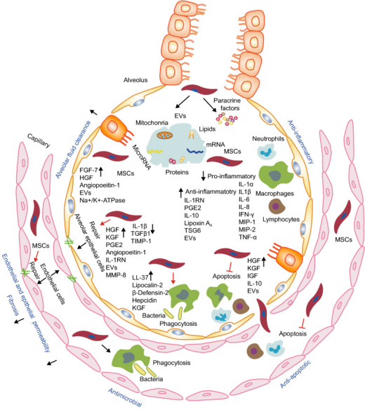 YFQLXB-UC01注射液的主要有效成分为脐带来源的间充质干细胞(UCMSC),UCMSC治疗急性呼吸窘迫综合征的作用机制主要有以下3个方面: