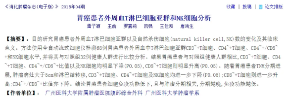 发表在《消化肿瘤杂志》的一项研究,胃癌患者外周血T淋巴细胞亚群和NK细胞分析表明:胃癌患者外周血中NK细胞数、活化程度明显低于正常人。且NK细胞数与胃癌患者的临床病理分期有密切关联,NK细胞数越少,胃癌患者的临床病理分期越晚[7]。