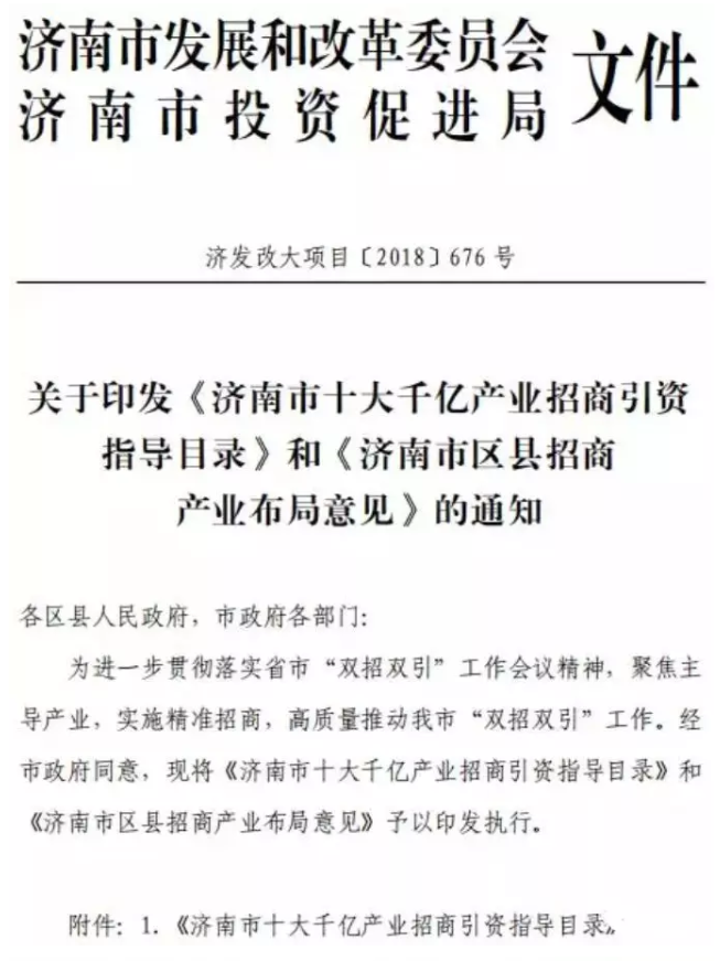 近日,济南市人民政府发展和改革委员会在官网正式发布了《济南市十大千亿产业招商引资指导目录》和《济南市区县招商产业布局意见的》的通知,通知中明确将