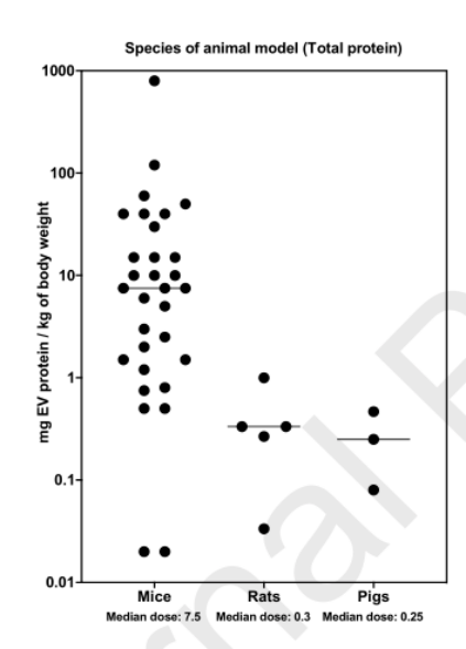 不同的实验动物(大鼠、小鼠、猪)、给药途径(系统性/局部)、研究领域(心血管、神经、炎症、癌症)等,临床前以及临床上所用的EVs剂量大有考究。