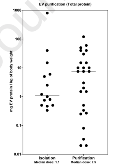 直接分离方法(如沉淀或超滤),根据大小或密度使用EVs纯化方法(超离、尺寸排阻等),用于EVs纯化的技术会影响最终制备中外泌体的总蛋白质数量。有趣的是,使用直接分离方法(如沉淀或超滤)的研究中的中位治疗剂量比使用基于大小或密度的EVs纯化方法的研究低约10倍。