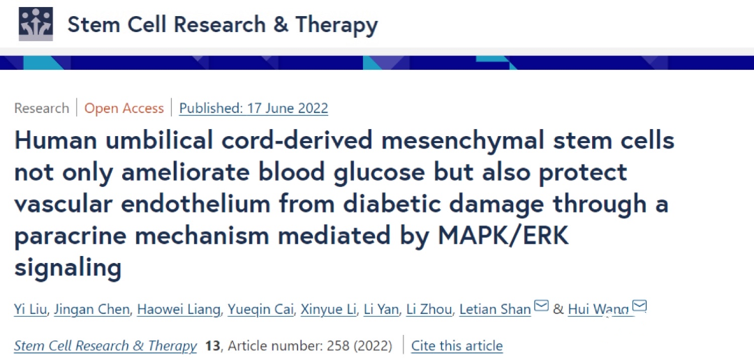 2022年6月17日,该杂志(影响因子:6.832)刊载的另一则研究证实[1]:间充质干细胞(MSCs)不但能降低血糖,还可以通过MAPK/ERK信号介导的旁分泌机制保护血管内皮免受糖尿病损伤。在治疗糖尿病血管并发症上有着巨大潜力。