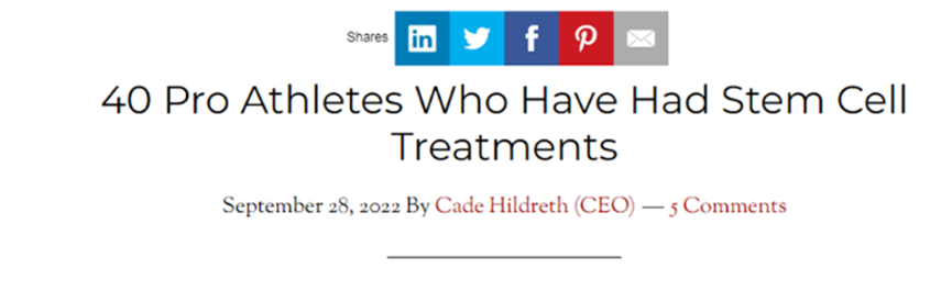 国外bioinformant网站上此前报道了40名使用干细胞治疗的运动员[5],他们有些在膝盖、臀部、脚踝、肩膀等其他损伤部位使用了干细胞以寻求康复,也有一些运动员采用其他的再生疗法,主要用于解决膝关节损伤和并发症、韧带断裂修复、软骨、肌腱和肌肉并发症、肘部损伤、腿部损伤等。
